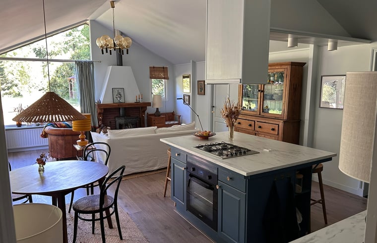 Ons vrijstaand vakantiehuisje (ong 90m2) en is sfeervol en comfortabel ingericht. Het heeft een zitruimte met een houtkachel, een ruime woonkeuken, en twee slpkm-ers met airco en badkamer. De vele ramen kijken uit op een prachtige tuin van 5000 m2...